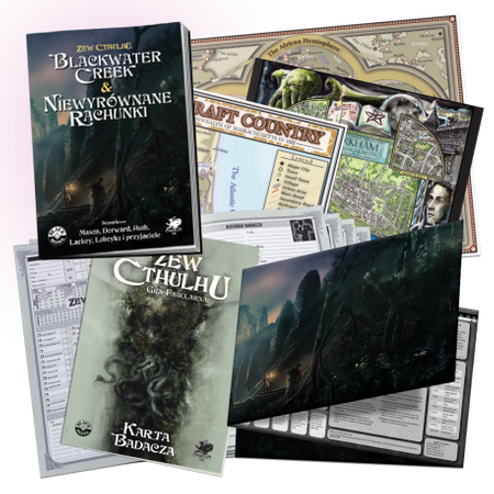 Dodatkowo zawiera 5 kart Badaczy i kolorowe Krainy Lovecrafta, Świata Cthulhu i Arkham i okolic.