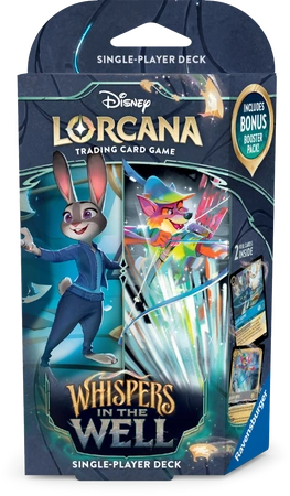 Disney Lorcana: Whispers in the Well - Deck - Judy Hopps & Robin Hood to gotowa talia zbudowana z 60 kart, idealna na początek przygody z grą. Produkt zawiera też 11 znaczników do gry, instrukcję i jeden Booster Pack zawierający 12 losowych kart pozwalających rozbudować talię.